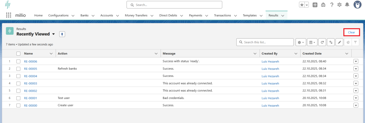 A list of these result records can be found in the "Results" tab. In case of success, the "Success" message is displayed. In case of error, the corresponding error.
