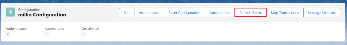 | Authenticated | Mandatory field | Indicates whether millio is connected to Salesforce and finAPI. |