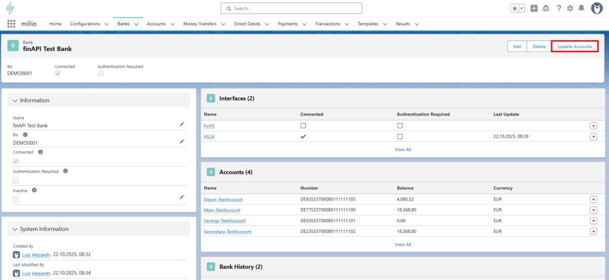 millio connects all your bank accounts to your Salesforce system and allows you to fully organize your banking transactions from within your Salesforce environment and access your accounts in a single interface.