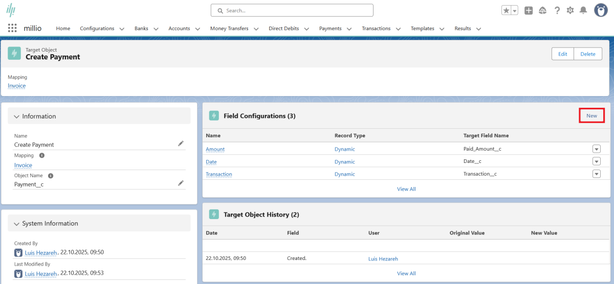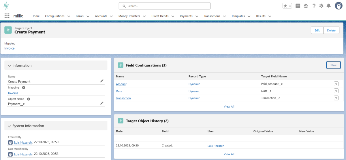 After clicking on "Create", the created "Payment" record will be displayed.